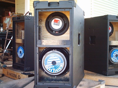 The boxes' first gig - an outdoor show Overall response of these is quite good, being reasonably flat from 200Hz to 1.5kHz where the JBL 2445 is crossed over. Attempts at increasing the top end of the 12 were unsuccessful, and as such the boxes exibit some harshness around 2kHz thanks to the 2" HF drivers |