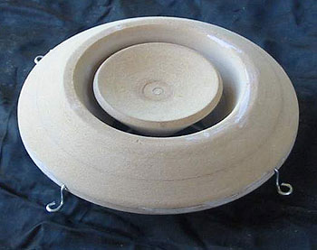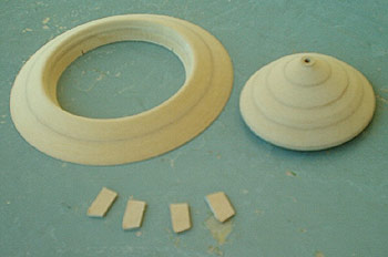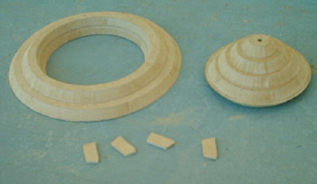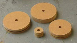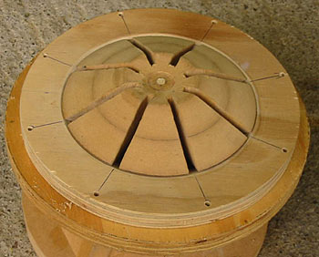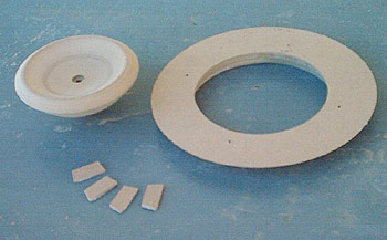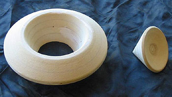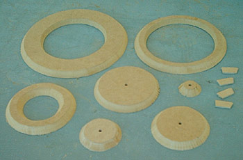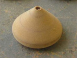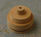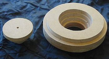 Simple type 1 This was used in my twin 8" box, and plug size is 62mm dia x 44mm long. Using a hole saw, I cut 4 discs from 12mm MDF : 2x 62mm dia, 1x 44mm dia, and 1x 18mm dia as shown in photo below left. These were then glued together (centre photo), then machined to shape (right photo). The central hole was then plugged with 1/4" dowel. No supports were designed into this plug, as it was glued to a central flare divider. For mounting options, see others below. |