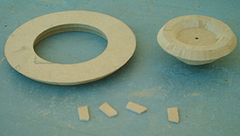 an improvement, but not enough to warrant its use. Note the slots cut in some of the parts - these formed holes through the parts after assembly, and facilitated mounting by steel wires as shown below. |