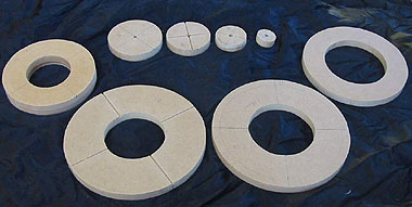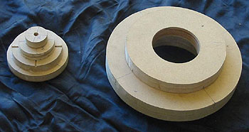 Practical construction These plugs aren't too difficult to make with the right tools. One thing you will need is a lathe - it doesn't have to be an expensive one, and you can even make one yourself utilising your electric drill - see the tools section on my main DIY page for details! (all of the examples shown below were turned on this). The construction method I use is to cut circles or rings from MDF, stack and glue them together, and then machine them to shape. The stacks are mounted on a 1/4" threaded rod which runs chuck to chuck in my DIY lathe, or in the case of rings, temporarily screwed to a backing plate. Photos below will make this clearer. |