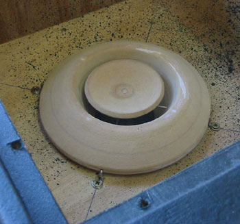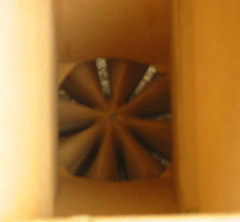 run them to a high crossover frequency - see link. Here is shown an experimental version I tried for an 8" speaker - extremely difficult and time consuming to make (and to visualise while designing it), and it gave absolutely no benefit over the simple type ultimately chosen. I include it here as an interesting oddity, and suggest no-one try it. Below left is the back (speaker side) of the plug in its baffle - it is easy to see where the name radial slot came from. Directly below is a view down the throat - sorry about fuzzy pic. |