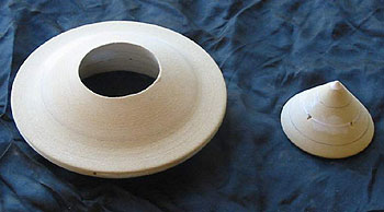 pretty much the same as 12" version above - just smaller and more fiddly. At left is an Autocad render of section through plug and Eminence Alpha 6 speaker - the paths can be clearly seen. Centre plug is 25mm dia x 31mm long, made with 2 disks of 16mm MDF 25mm dia & 17mm dia. Outer toroid is 80mm dia outside, 36mm dia inside x 27mm deep, made with two MDF rings 80mm OD, 36mm ID x 16mm thick & 65mm OD, 36mm ID x 12mm thick. The assembled view is shown below left, while below right shows how close the plug sits to the Eminence cone. Below this is shown the treatment of the baffle - 72mm dia hole chamfered 45 degrees to a depth of 9mm. Note the support wire retention slots. |