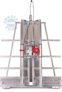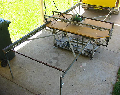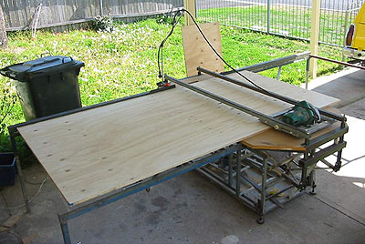 saw. Common amongst Australian DIYers, and professionals for onsite work, is the Triton Workcentre. This versatile unit features quite a number of add-on options for various operations, however is not really suited to continually working with 4' x 8' sheets of plywood. I also looked at a few other more upmarket dedicated table saws and they had similar limitations, as well as being expensive.. A saw type which is at home with large sheets is the vertical panel saw. However, whilst good at large cuts from large sheets, they are not suitable for small angular work, and tend to be rather pricey. Whilst researching saw types, I came across the Versatool Workcenter. This ingenious saw is targeted at a similar group to the Triton (and has the same size limitations), but the layout and tooling options intrigued me. Unfortunately, it seems to be no longer in production (have no idea why - appeared to be a brilliant unit). The overhead layout with the tool head running on rails is similar to a panel saw in a horizontal format, and I thought a combination of these two types would be the ideal saw for my application. |