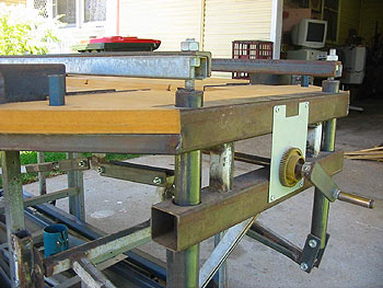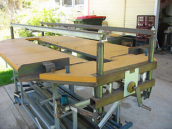 required, and were reinforced with 1/4" steel angle. For a support base, I pressed into service an old frame from a Sharp SD2060 photocopier I had stripped. This 1" square RHS steel frame is quite sturdy and was fitted with casters. I made a bed frame from 1" RHS and topped it with two layers of MDF. The top layer of MDF was actually smaller separate sheets with the bottom edges routed, forming "T" slots across the table. To reduce the size for storage, extensions would be used when dealing with full sheets. |