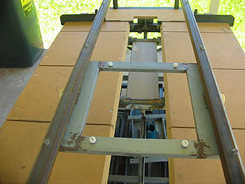 and the locking thumbwheels can be seen on the sides. The central cutout section in the bed allows the saw blade clearance in any position. The cover piece just under the cutout keeps sawdust out of the height winder thread. |