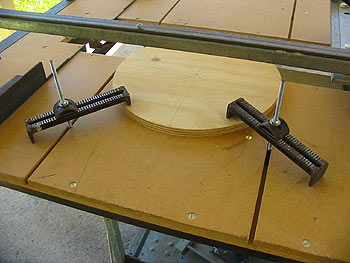 The circular saw attached to its plate in the frame. Clamp plates allow the